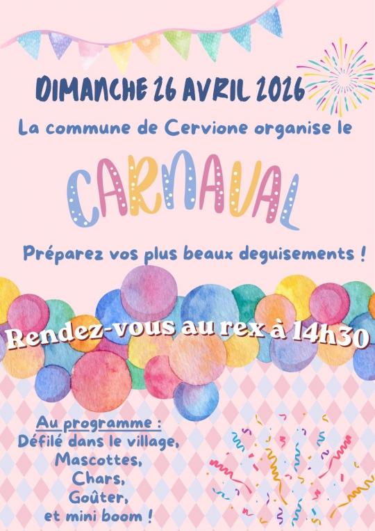 Dimanche 26 avril, déguisez-vous et venez fêter le carnaval à Cervioni. Le départ se fera à 14h30 devant le Rex. Au programme : défilé, musique, animations et bonne humeur pour petits et grands !