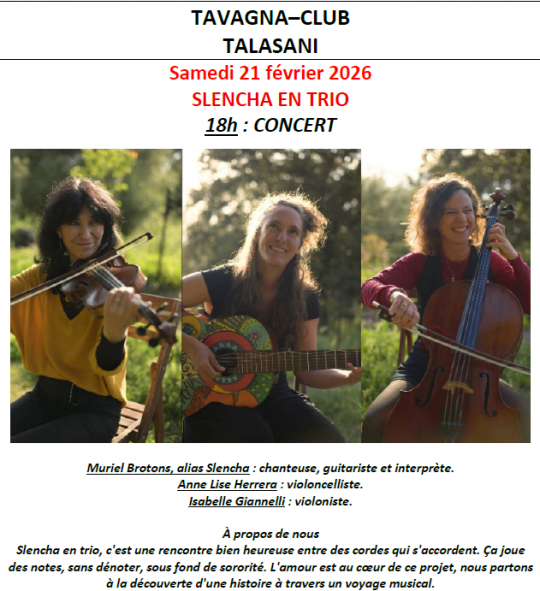 Le Tavagna-Club de Talasani accueille Slencha en trio le samedi 21 février à 18h pour un concert tout en douceur et en émotions porté par la voix de Muriel Brotans, accompagnée au violon par Isabelle Giannelli et au violoncelle par Anne Lise Herrera.
