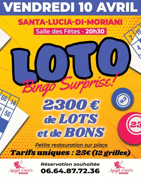 L’Association Angel even’s est heureuse de vous inviter à son Loto 2026 qui se déroulera vendredi 10 avril à la salle des fêtes de Santa Lucia Di Moriani.